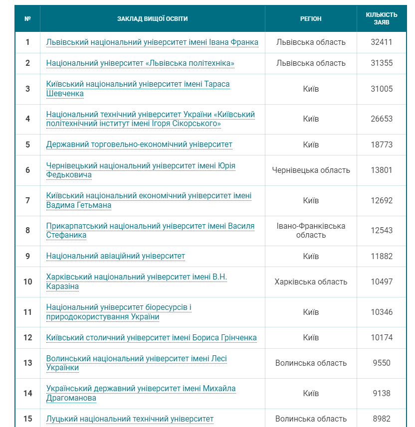 Також до двадцятки лідерів за кількістю поданих заяв увійшли заклади вищої освіти Чернівців, Івано-Франківська, Харкова, Луцька, Дніпра, Ужгорода, Тернополя й Одеси.