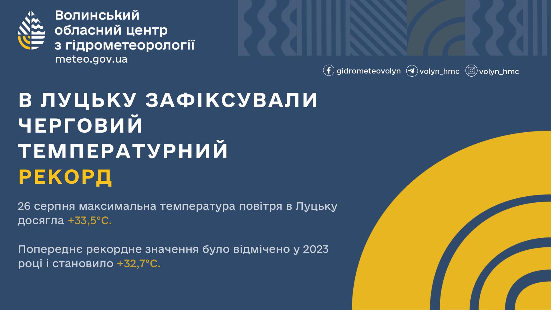 За даними спостережень метеостанції, 26 серпня максимальна температура повітря в Луцьку перевищила на 0,8°C рекордне значення 2023 року і склала +33,5°C.