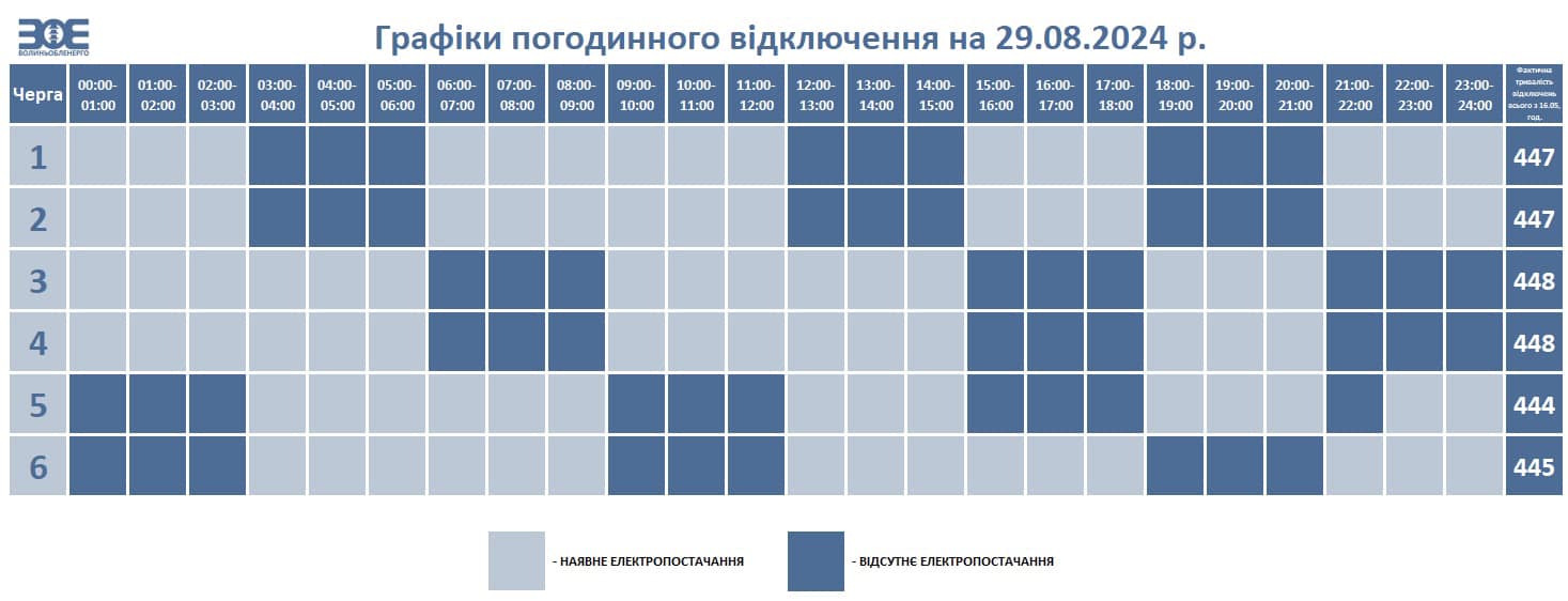 У четвер, 29 серпня, на території Волинської області знову буде діяти графік погодинних відключень світла.