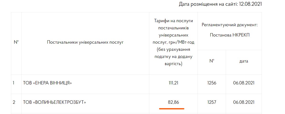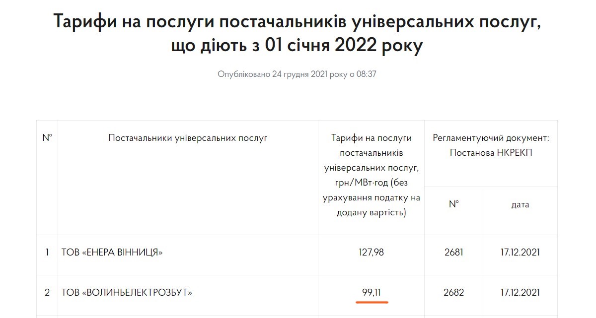 На Волині тариф на послуги ТОВ «Волиньелектрозбут» у 2021 році складав 82,86 грн/МВт·год, а наступного року зріс до 99,11грн/МВт·год.