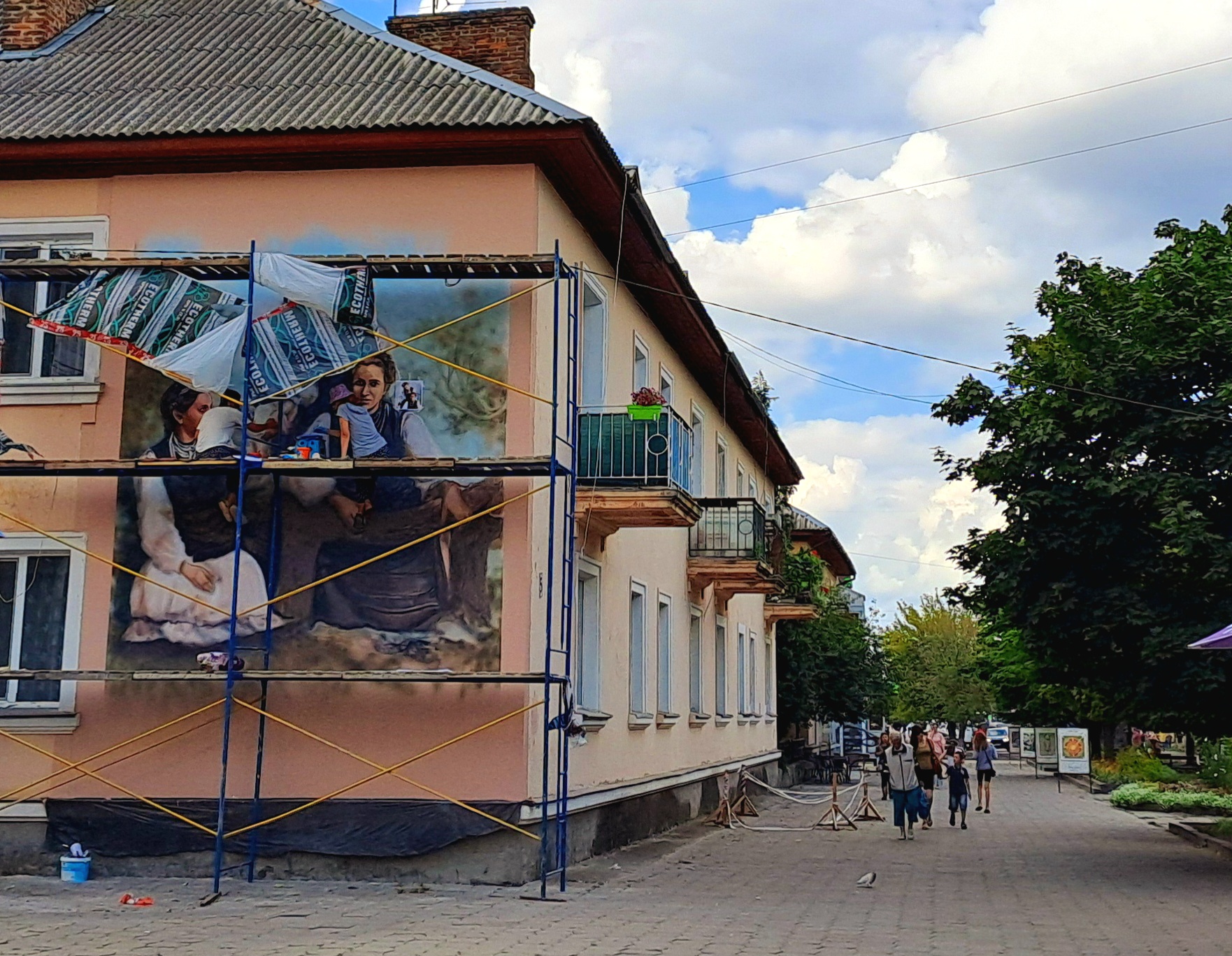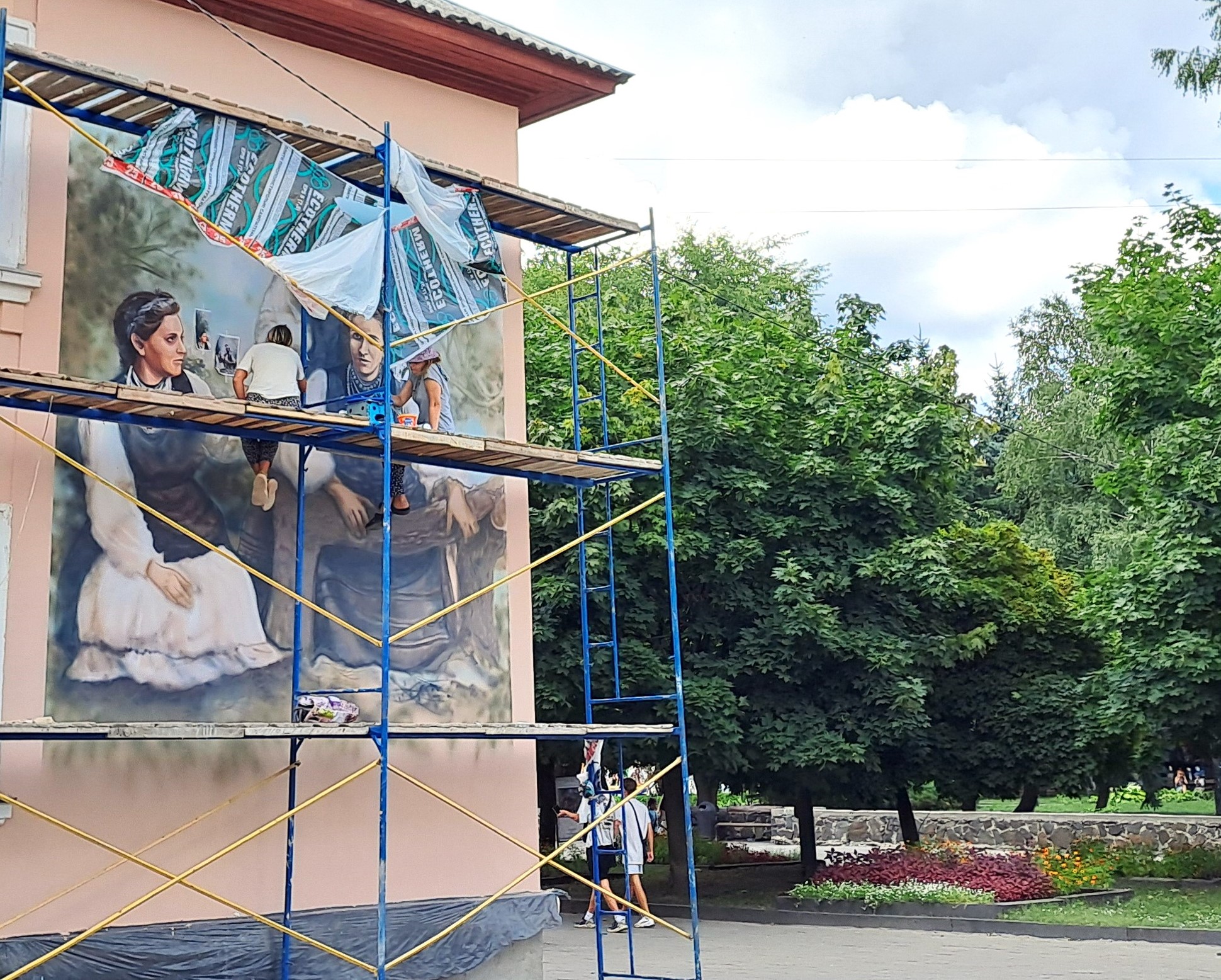 Світлана Солодун та Оксана Цюп’яшук, які уже мають досвід у створенні муралів, відтворюють на стіні знімок, який був зроблений у ковельському фотосалоні Ізраїля Епштейна у 1896 році.