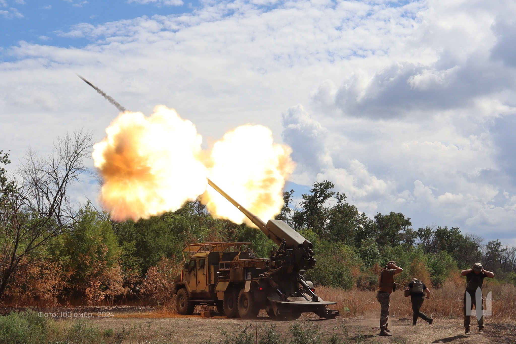 Гармаші артилерійського дивізіону 100 омбр нищать ворога на фронті за допомогою української 155-мм САУ 2С22 «Богдана».