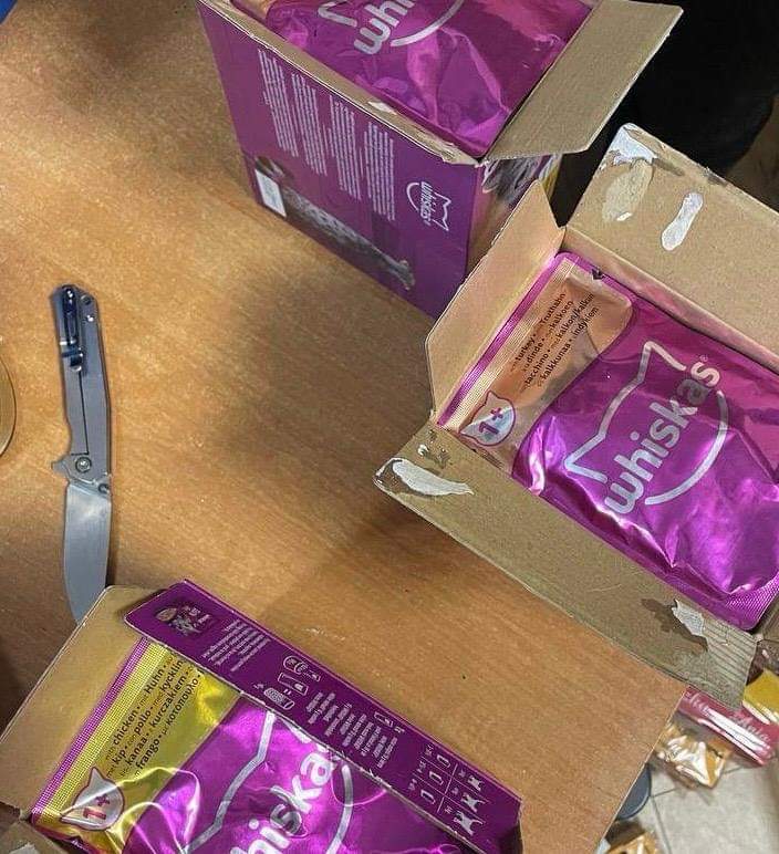 Заборонений до переміщення товар сховали у торбу, набиту продуктами харчування та коробки від корму для котів.