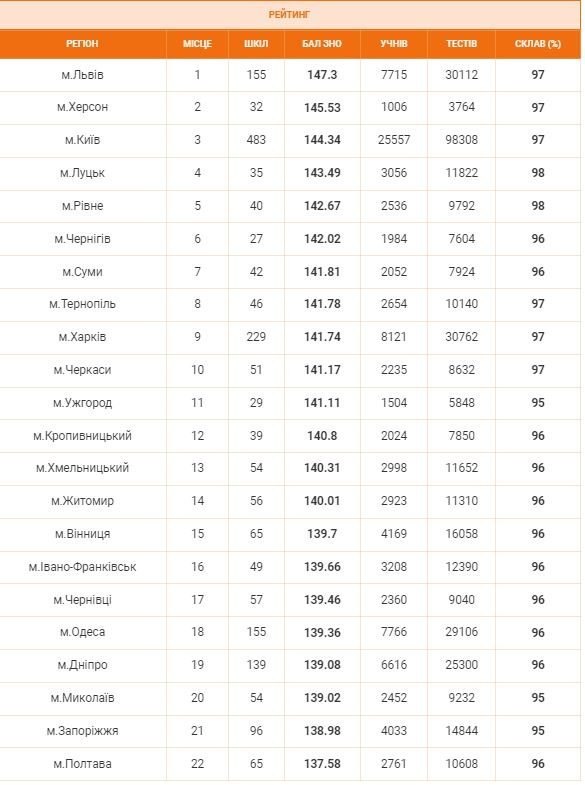 Обласні центри в таблиці ранжовані за рейтинговим балом, який розрахований на підставі середнього значення балів національного мультипредметного тесту, отриманих випускниками шкіл кожного обласного центру у 2024 році.