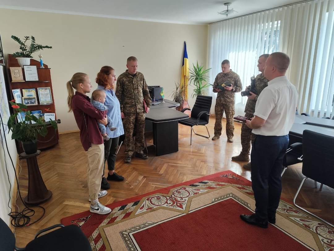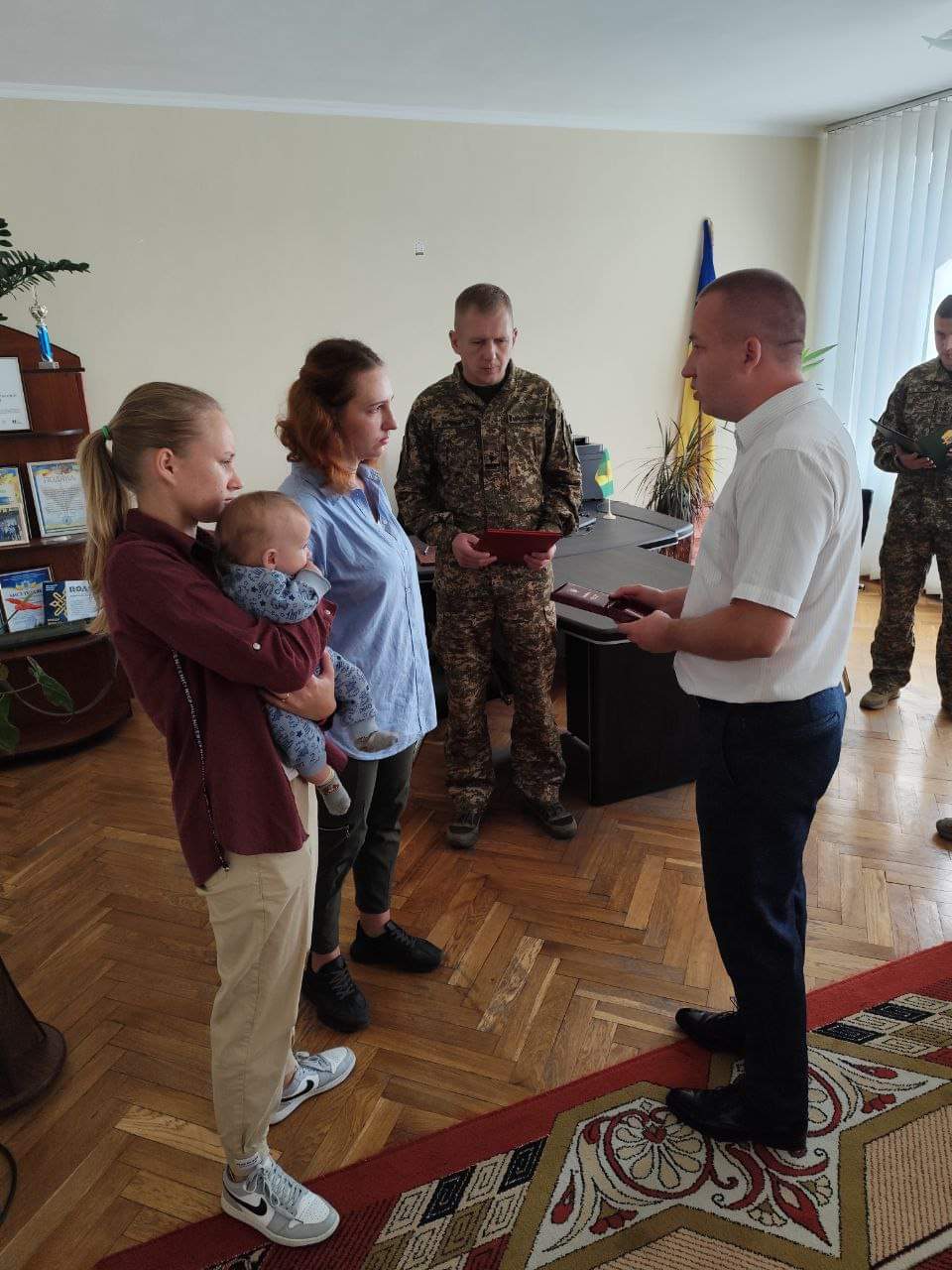 Міський голова Роман Ющук та представники Національної гвардії України вручили почесну відзнаку дружині полеглого воїна Вікторії та сестрі Анастасії.